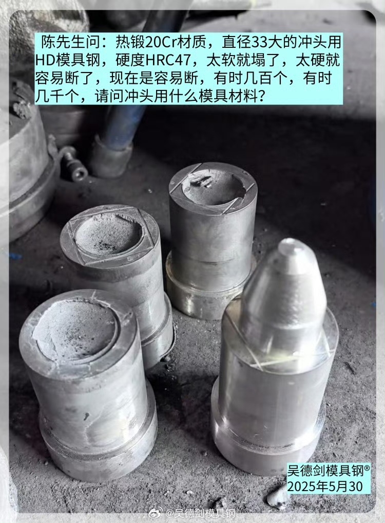 陳先生問:熱鍛20Cr材質(zhì),直徑33大的沖頭用HD模具鋼,硬度HRC47,太軟就塌了,太硬就容易斷了,現(xiàn)在是容易斷,有時幾百個,有時幾千個,請問沖頭用什么模具材料?