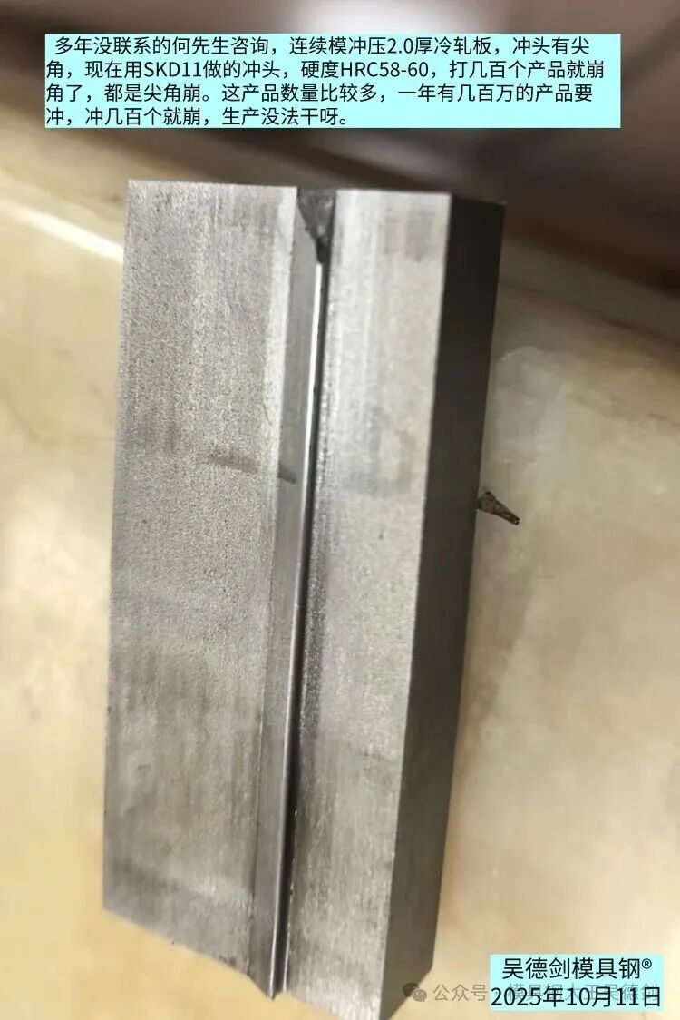 第二位是何先生咨詢,連續(xù)模沖壓2.0厚冷軋板,沖頭有尖角,現(xiàn)在用SKD11做的沖頭,硬度HRC58-60,打幾百個(gè)產(chǎn)品就崩角了,都是尖角崩。這產(chǎn)品數(shù)量比較多,一年有幾百萬的產(chǎn)品要沖,沖幾百個(gè)就崩,生產(chǎn)沒法干呀。