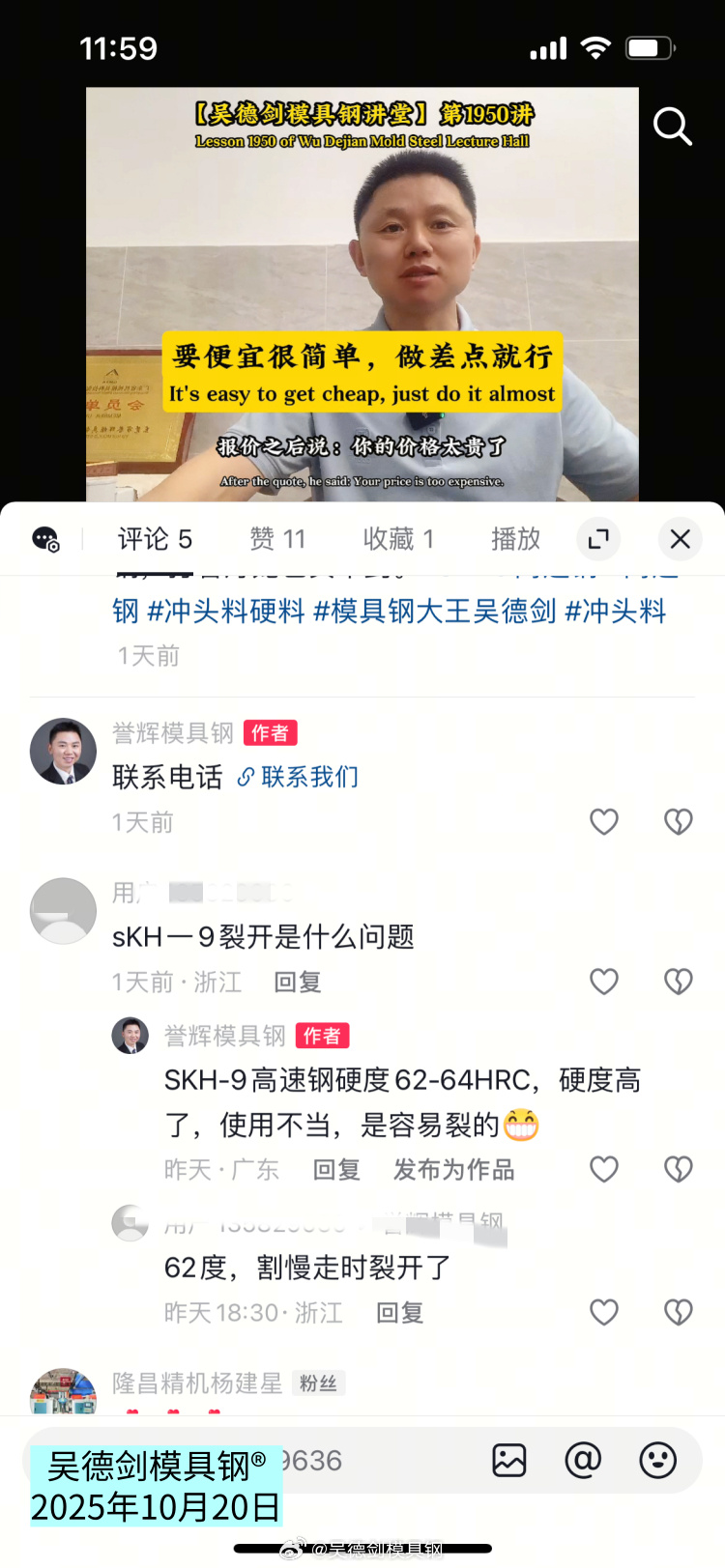 網(wǎng)友在視頻下面評論問:SKH-9裂開是什么問題?硬度62度,割慢走時裂開了。