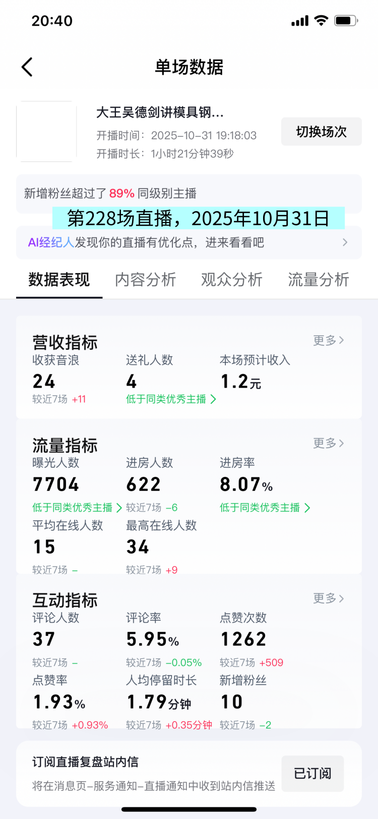2025年10月31日,我做了1小時(shí)的直播,這是本周的第5場(chǎng),也是我的第228場(chǎng)直播。