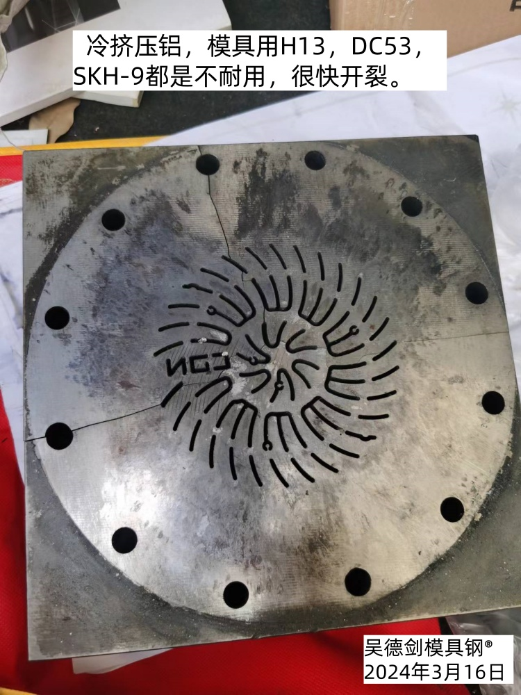 浙江易先生擠壓6061鋁材的汽車配件,模具原來用LD模具鋼,擠壓3000產(chǎn)品就會(huì)掉小米粒,模具死賴著用,頂多1萬產(chǎn)品,就會(huì)開裂報(bào)廢,調(diào)低硬度也無濟(jì)于事。