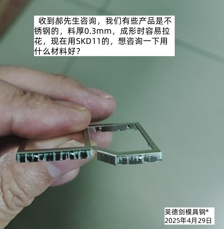 客戶的1個(gè)問題,我一般給出3個(gè)解決方案,解決用戶眼皮子低下的用鋼問題,是我每天的具體工作。郝先生折彎0.3mm厚不銹鋼屏蔽罩產(chǎn)品,SKD11模具鋼容易拉花零件,咨詢問不銹鋼折彎模具用什么材料好?介于他的工況,我偏向推薦8566防崩鋼。