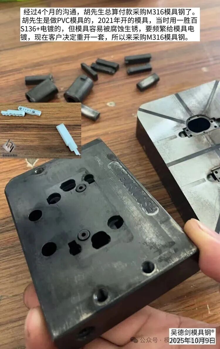 胡先生是做PVC模具的,2021年開的模具,當(dāng)時用一勝百S136+電鍍的,但模具容易被腐蝕生銹,要頻繁給模具電鍍,現(xiàn)在客戶決定重開一套,所以來采購M316模具鋼。