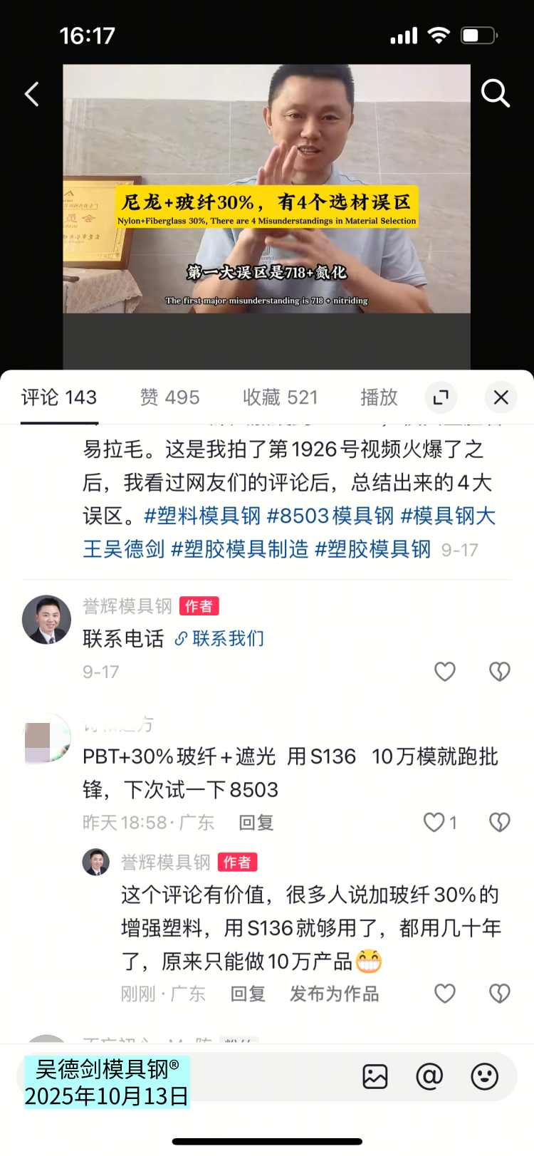 網(wǎng)友在我視頻下面評論說,注塑PBT+30%玻纖+遮光 用S136 10萬模就跑批鋒,下次試一下8503。