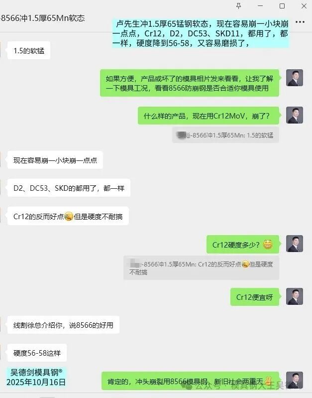 盧先生你沖壓1.5厚65錳鋼軟料,現(xiàn)在用的4款模具鋼,都是容易崩塊的,你更應(yīng)該嘗試8566防崩鋼。