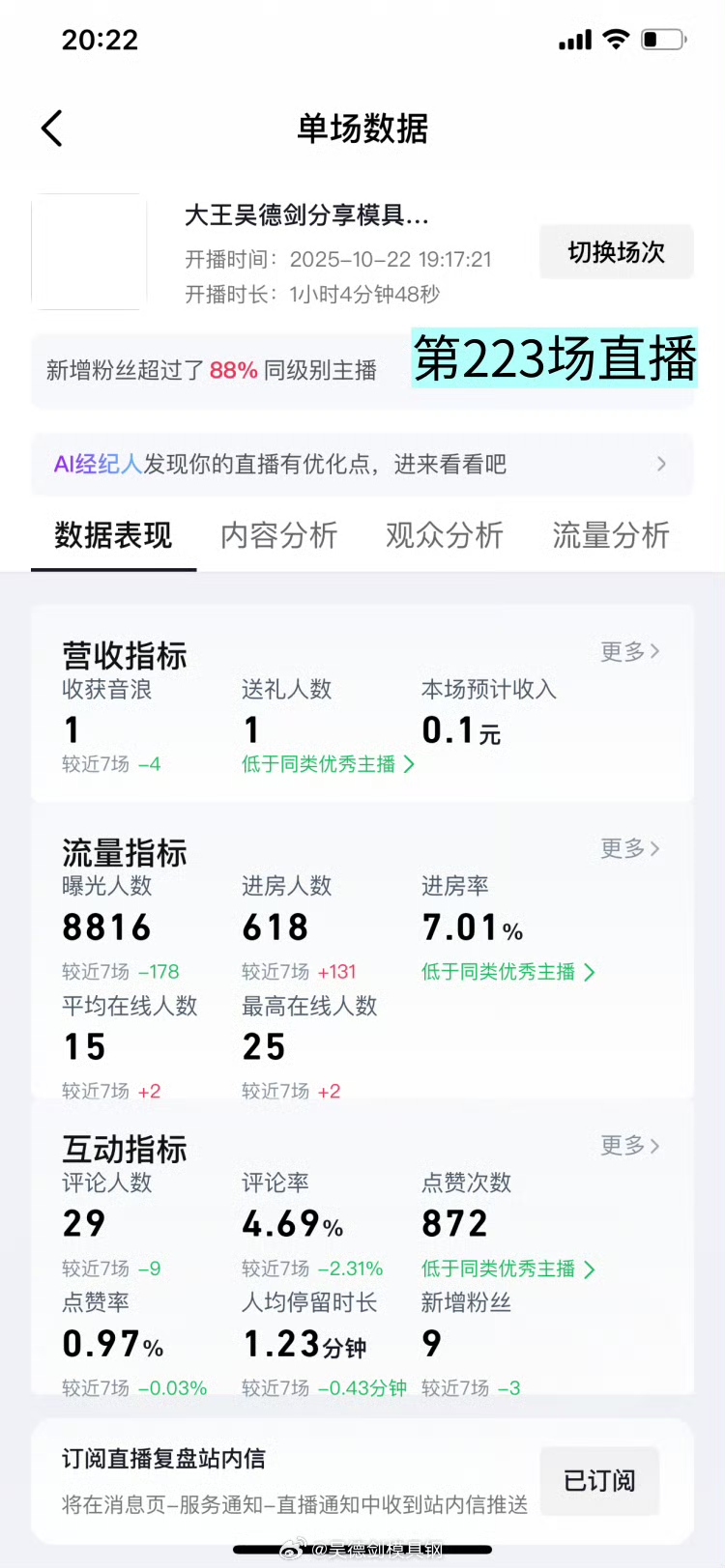 2025年10月22日,我做了1小時的直播,這是我第223場直播。