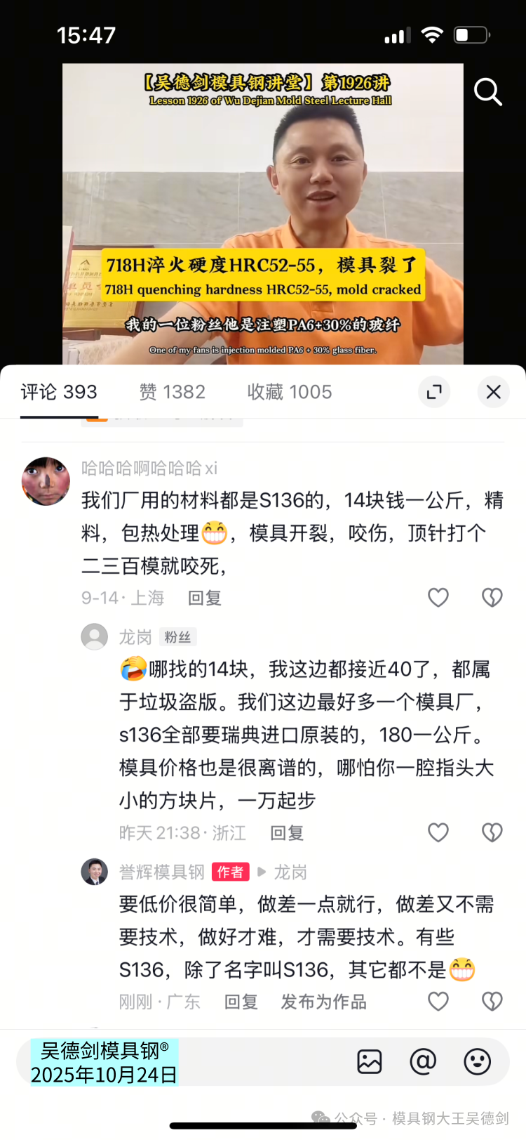 網(wǎng)友在視頻下面評(píng)論說(shuō):我們廠用的材料都是S136的,14塊錢一公斤,精料,包熱處理,模具開(kāi)裂,咬傷,頂針打個(gè)二三百模就咬死。